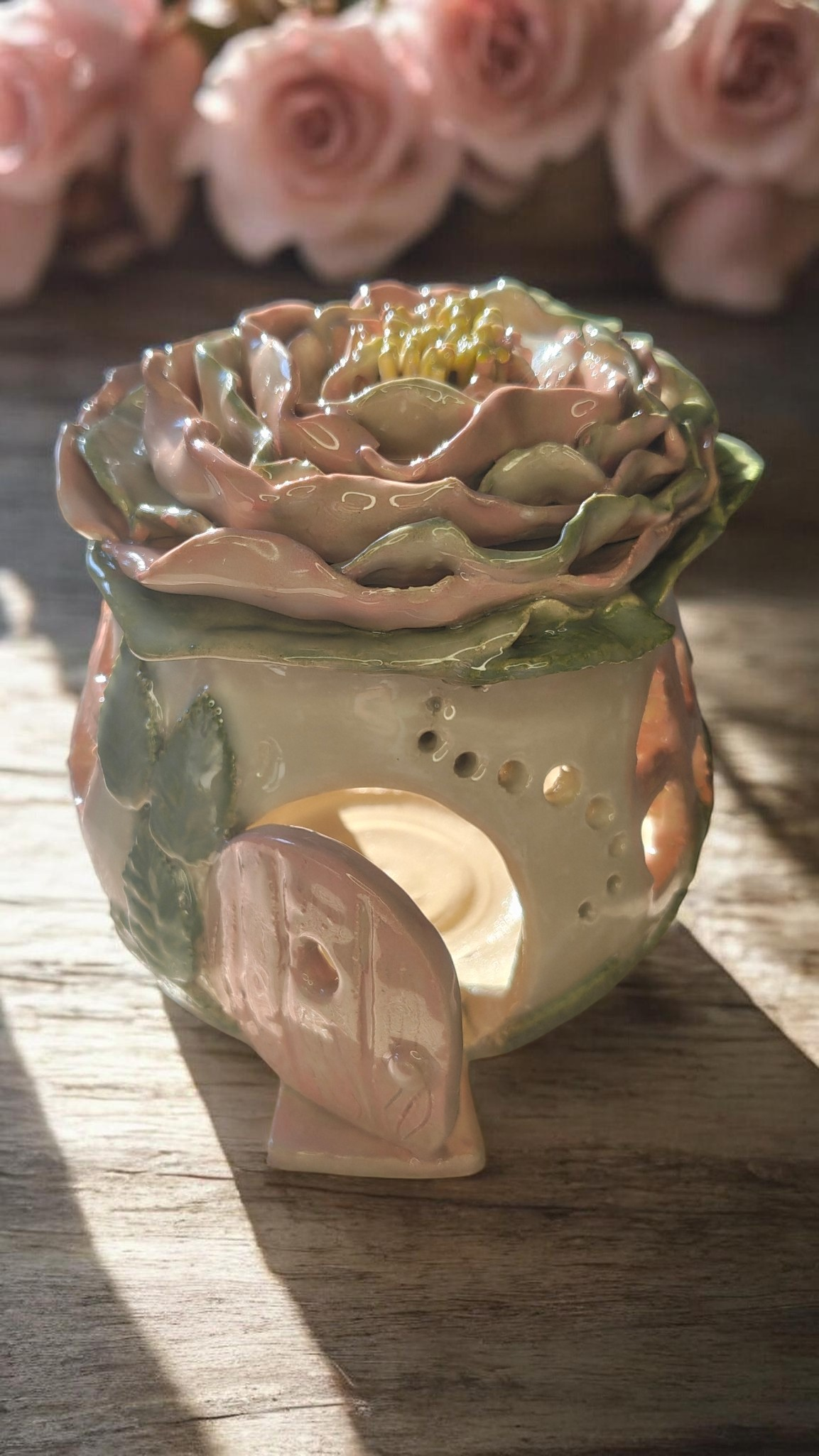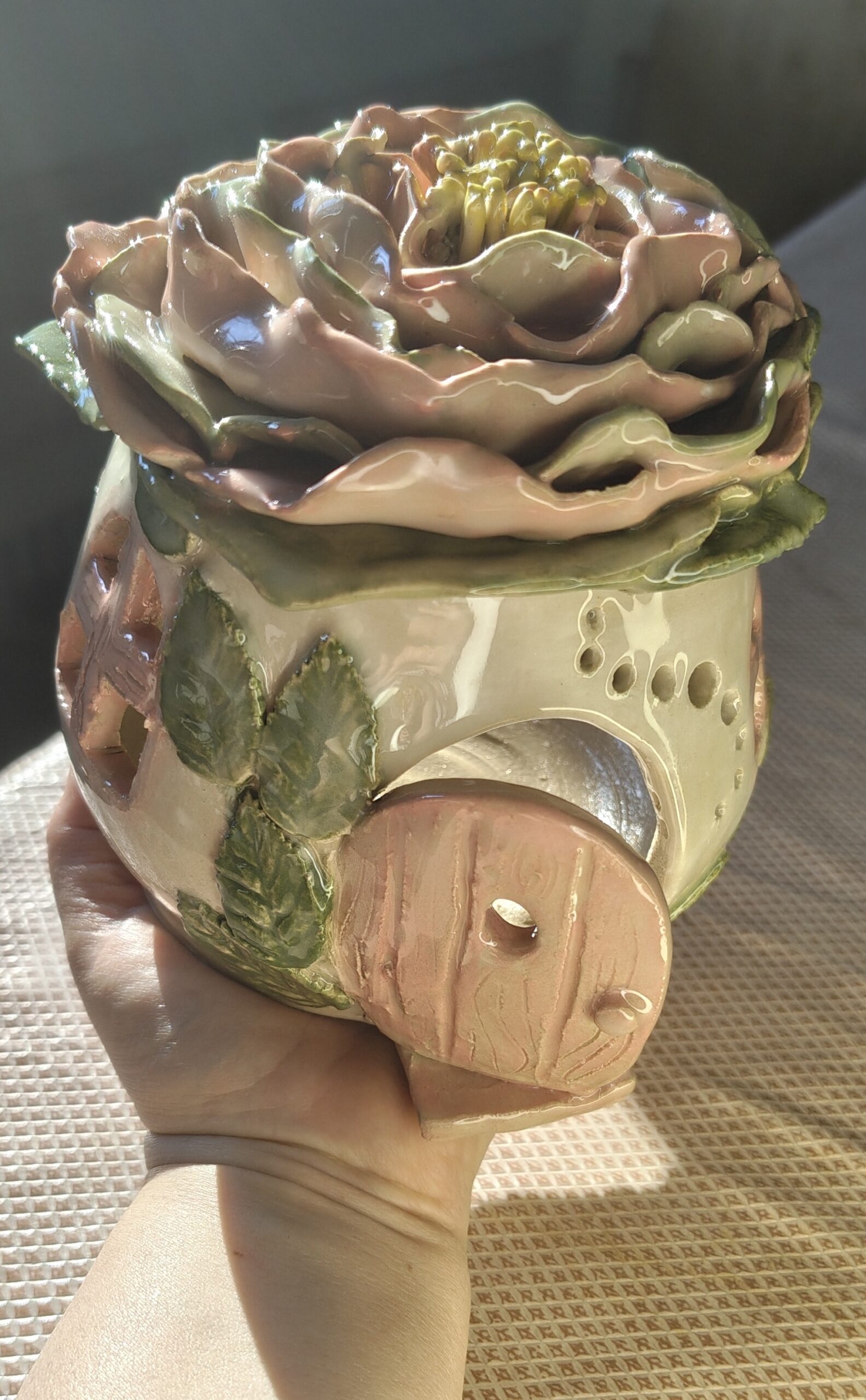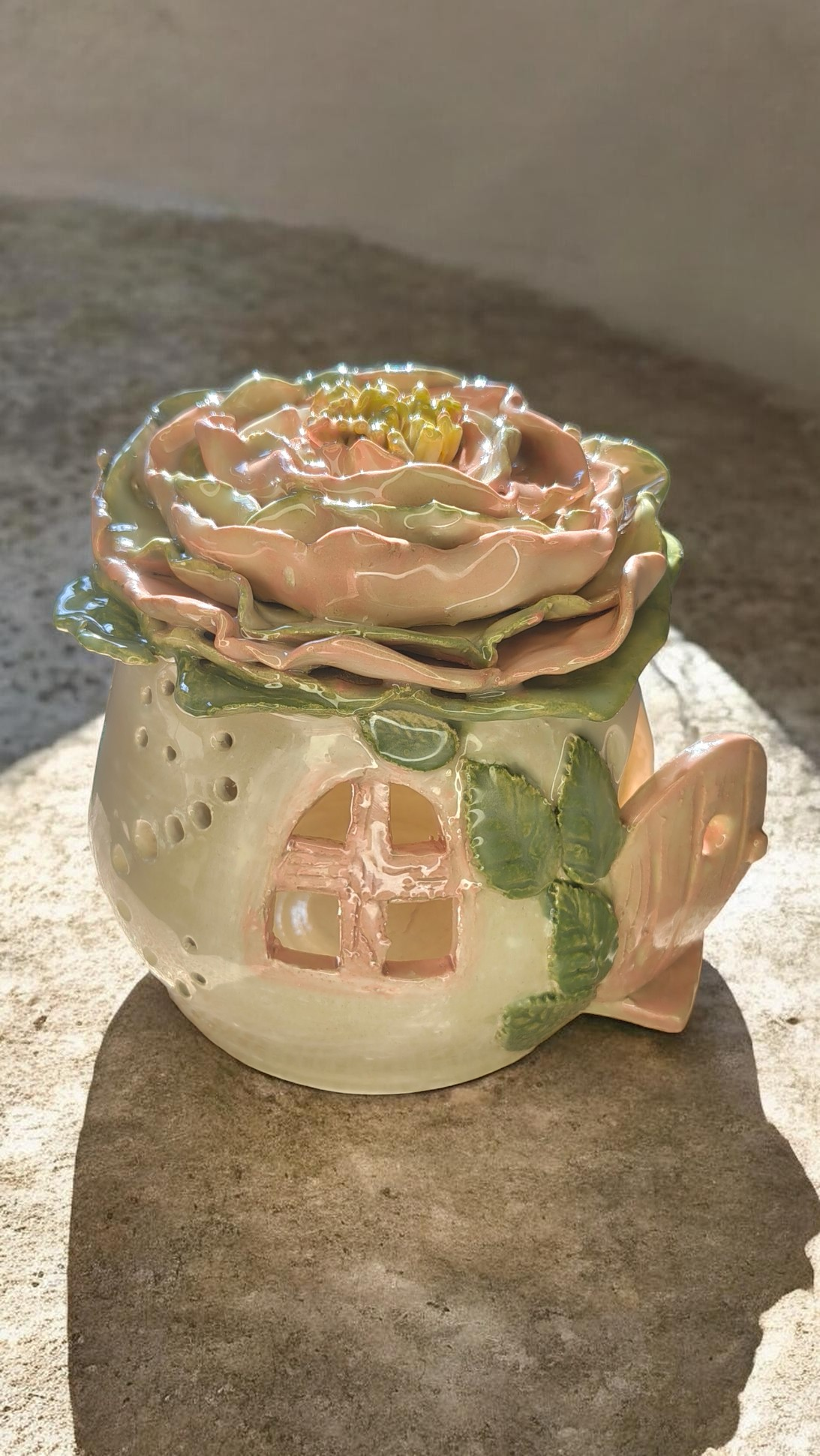 Ez a kézzel készült pasztell rózsás kerámia tündérház különleges dísze lehet kertnek, terasznak vagy akár beltéri növénykompozíciónak is. Minden darab egyedileg, kézzel formázva és festve készül, ezért nincs két teljesen egyforma házikó.