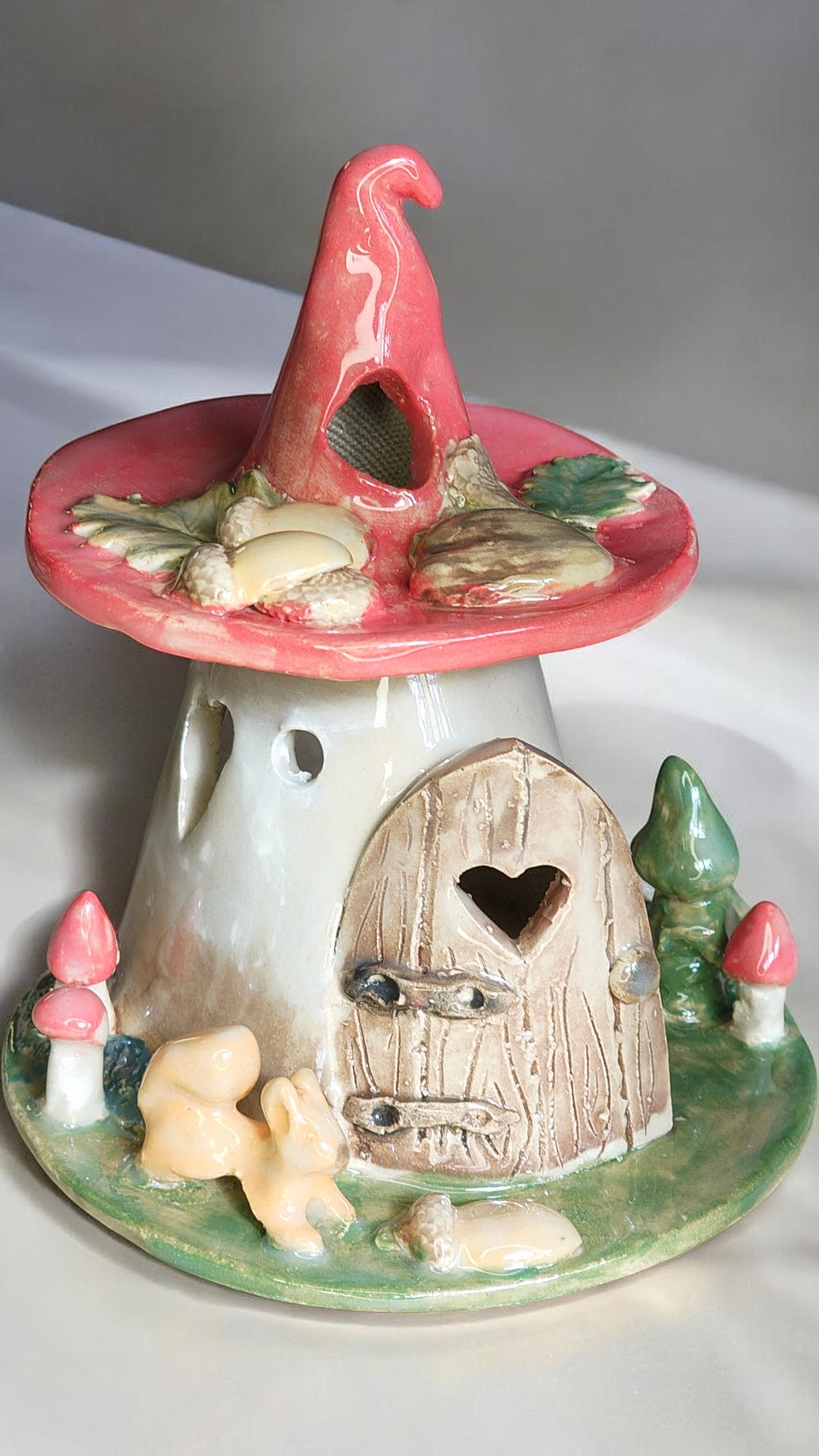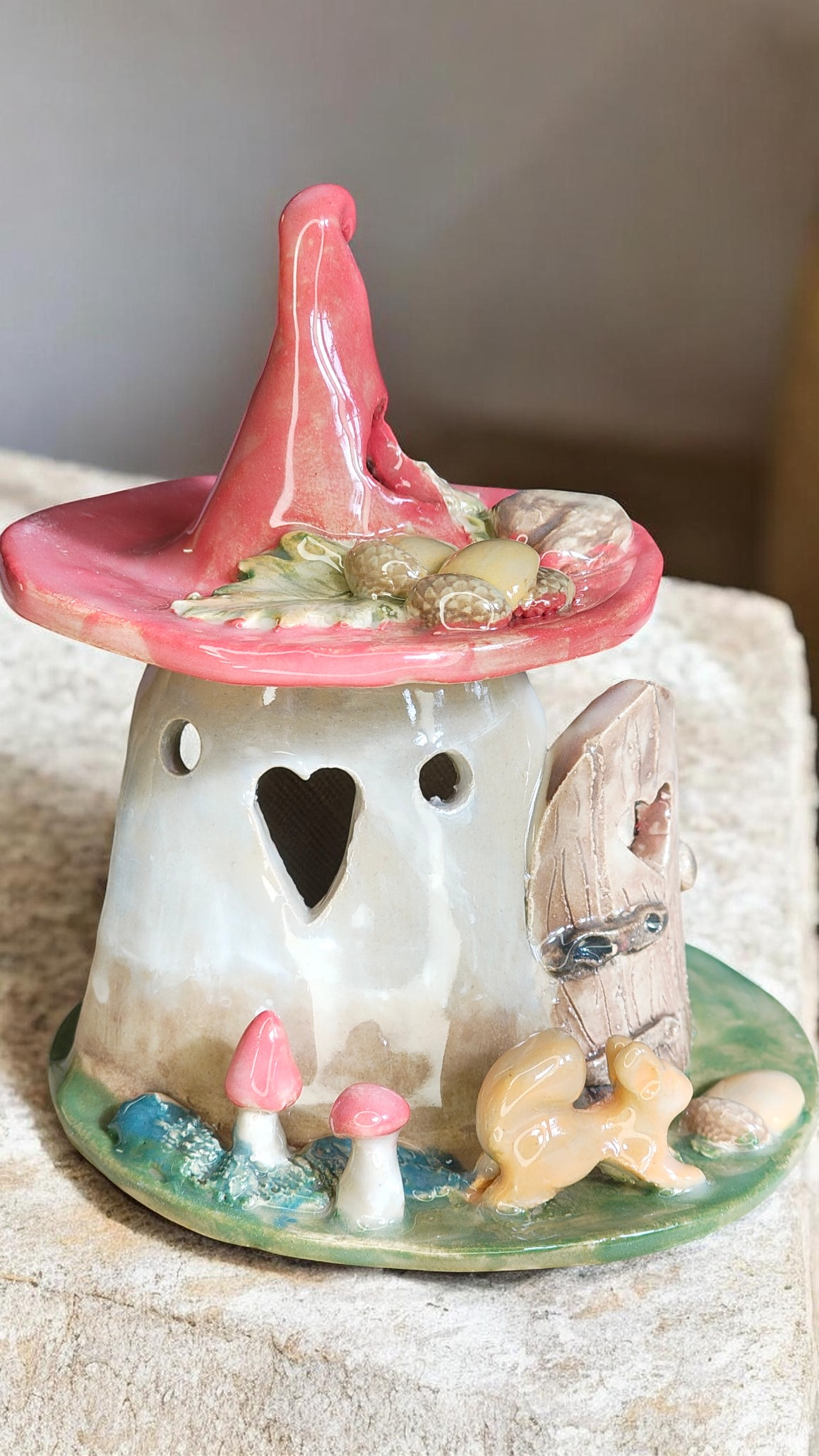 Ez a kézzel készült Mókuskás kerámia tündérház különleges dísze lehet kertnek, terasznak vagy akár beltéri növénykompozíciónak is. Minden darab egyedileg, kézzel formázva és festve készül, ezért nincs két teljesen egyforma házikó.